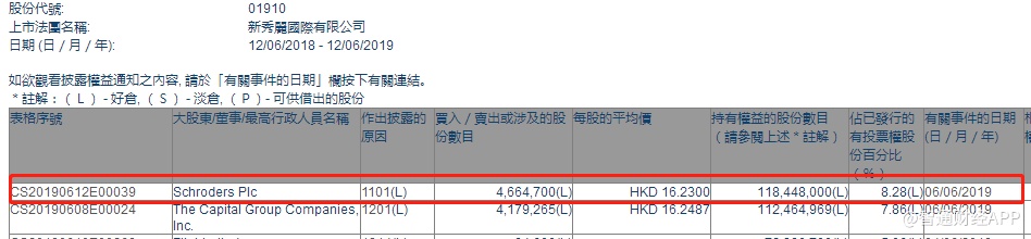 智通财经APP获悉,根据联交所资料显示,施罗德于6月6日增持新秀丽(01910)466.5万股,每股作价16.23港元,总值约7571.30万港元,最新持股数目1.18股,最新持股比例为8.28%。