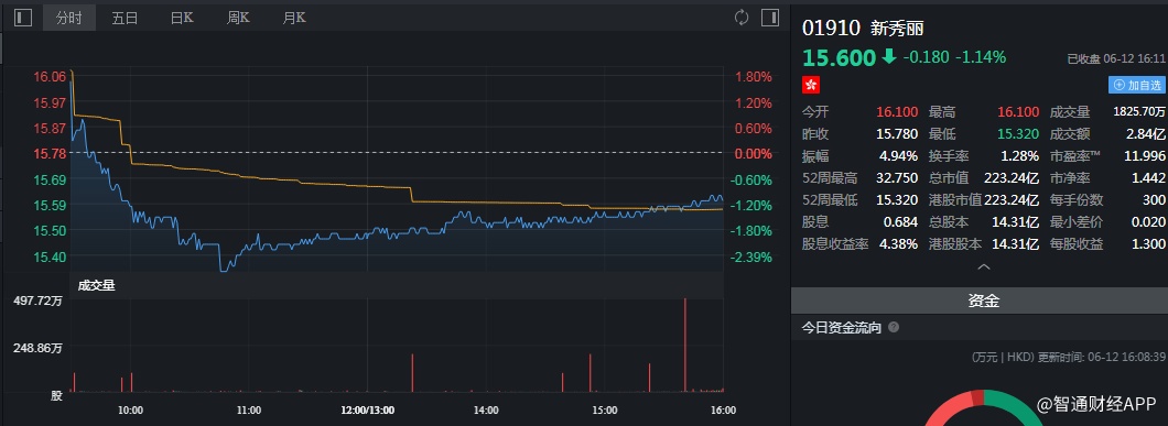 截至今日收盘,新秀丽(01910)跌1.14%,报15.60港元。