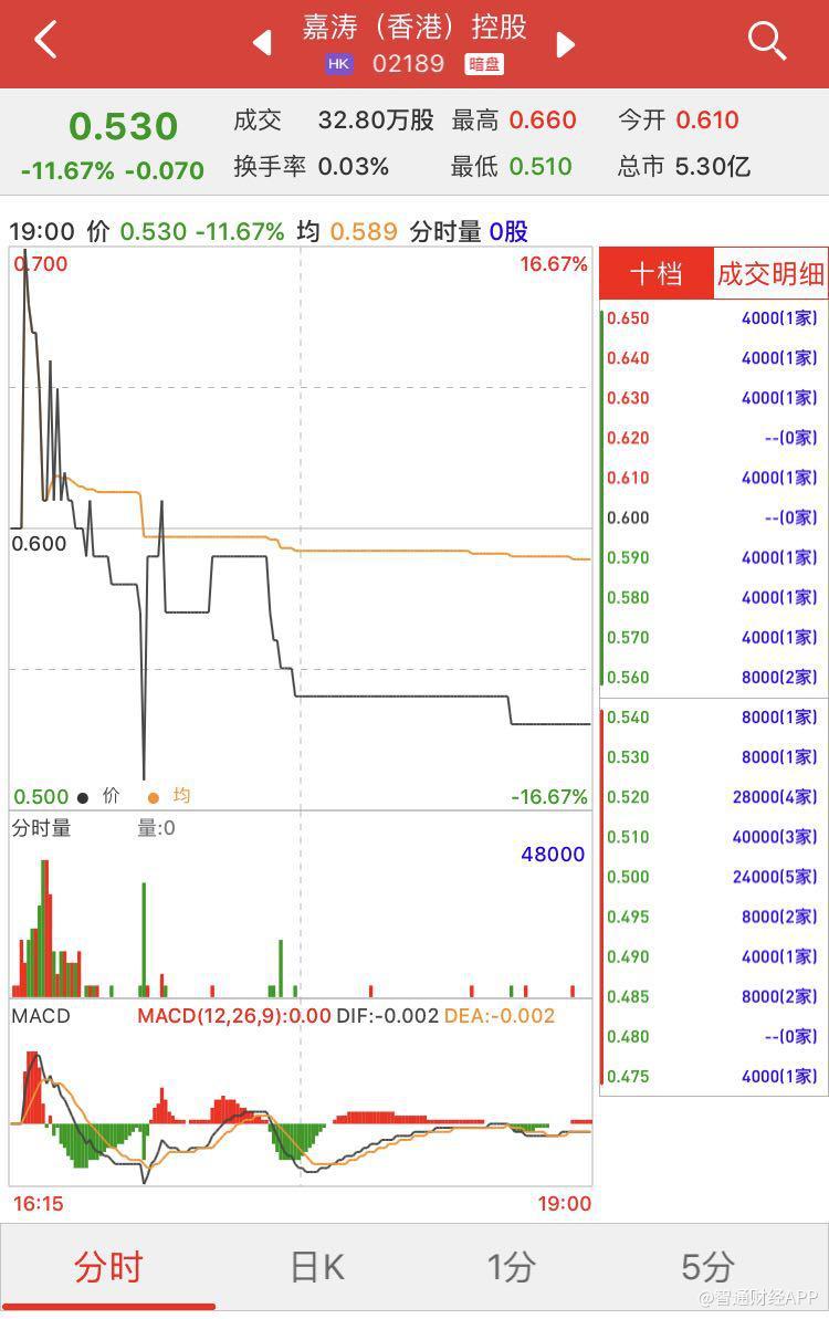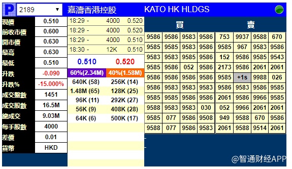 智通财经APP获悉,嘉涛(香港)控股(02189)将于6月13日挂牌,上市前夕,其暗盘收报0.51港元,较招股价0.60港元,跌15%。每手4000股,不计手续费,每手亏360港元。