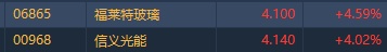 华泰证券分析称,去年“531”新政导致光伏玻璃下半年盈利能力下降、产能收缩,今年全年考虑在建产能,供给压力也相对较小;而光伏装机规模预期好转,双玻组件渗透率提升进一步提升光伏玻璃需求,预计全年光伏玻璃供给存在供应缺口,行业景气度有望继续回升。截至发稿,光伏玻璃行业另一个股信义光能(00968)涨4.02%。