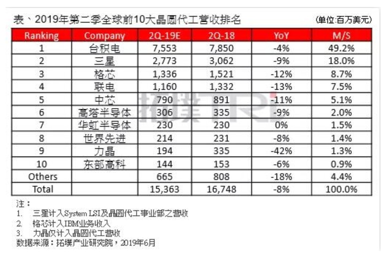 智通财经APP获悉,据集邦咨询旗下拓墣产业研究院最新报告统计,2019年第二季度全球晶圆代工需求持续疲弱,各厂营收与去年同期相比普遍下滑,预估第二季全球晶圆代工总产值将较2018年同期下滑约8%,达154亿美元。