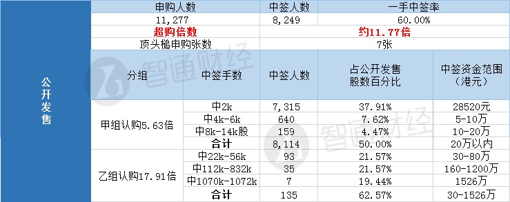 其中,公开配售申购人数11277,一手中签率60%,认购倍数11.77倍。