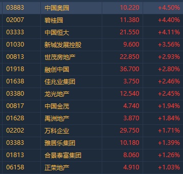 智通财经APP获悉,内房股午后逆市走强,个股涨幅纷纷扩大,截至发稿,中国奥园(03883)、碧桂园(02007)、中国恒大(03333)涨超4%,新城发展控股(01030)涨3.56%,融创中国(01918)、佳兆业集团(01638)涨超2%。