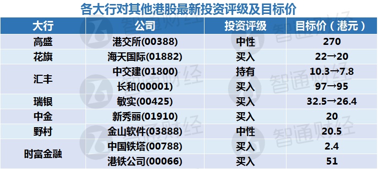 各大行对其他港股最新投资评级及目标价: