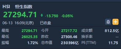 截至收盘,恒生指数跌13.75点或0.05%,报27294.71点,全日成交额达812.58亿。国企指数跌0.21%,报10472.44点,红筹指数涨0.35%,报4323.88点。
