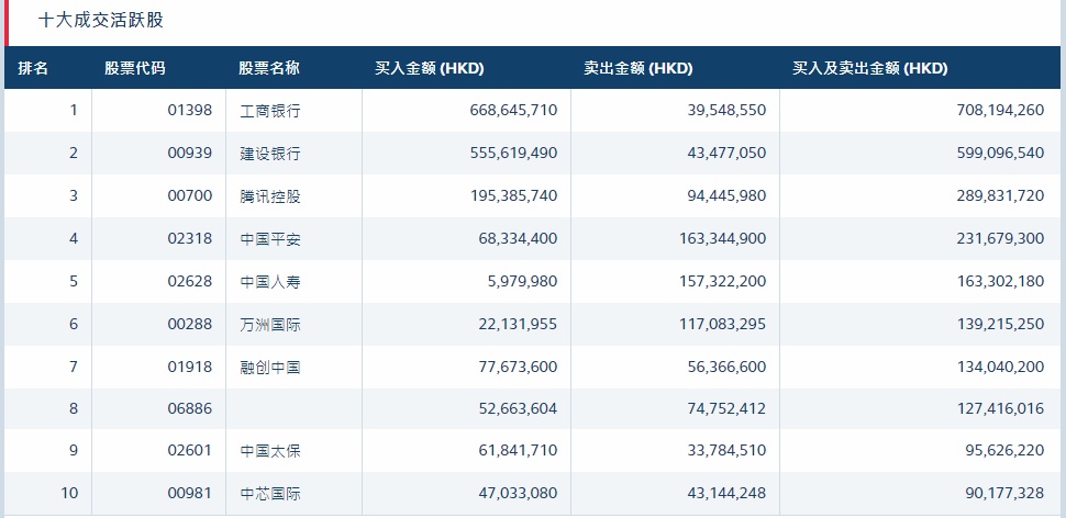 港股通(沪)十大活跃成交股