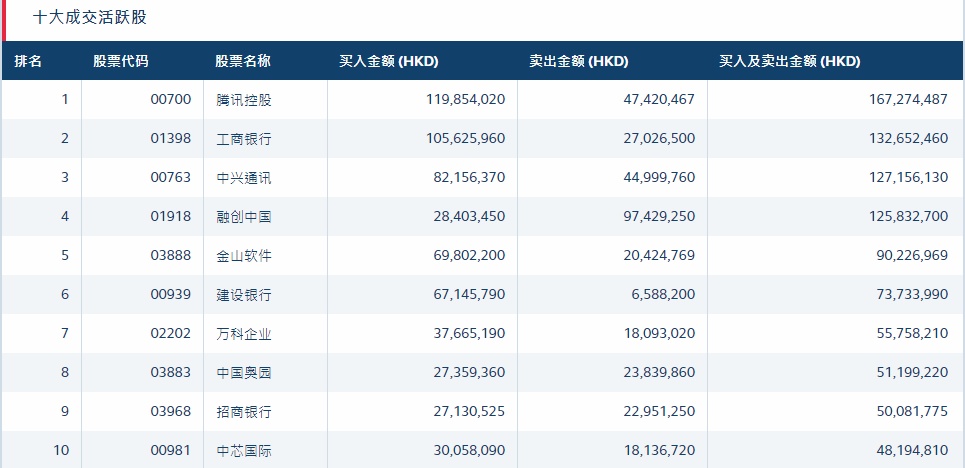 港股通(深)十大活跃成交股