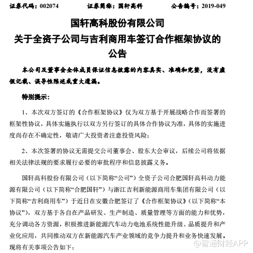 智通财经APP获悉,6月13日,国轩高科(002074.SZ)晚间公告显示,旗下全资子公司合肥国轩与吉利(00175)商用车近日签订《合作框架协议》,双方基于各自在产品研发、生产制造、质量管理等方面的能力和优势,充分调动各方资源,积极推进新能源汽车动力电池系统性能升级、品质提升和产业化应用,共同推动双方在新能源汽车产业领域的竞争力提升和业务快速发展。