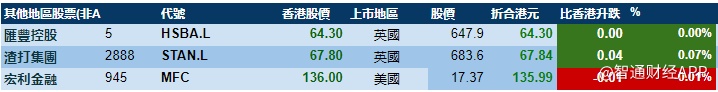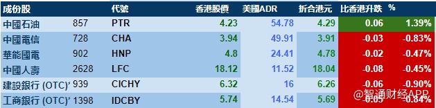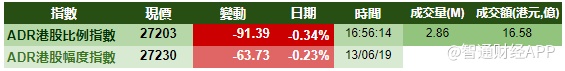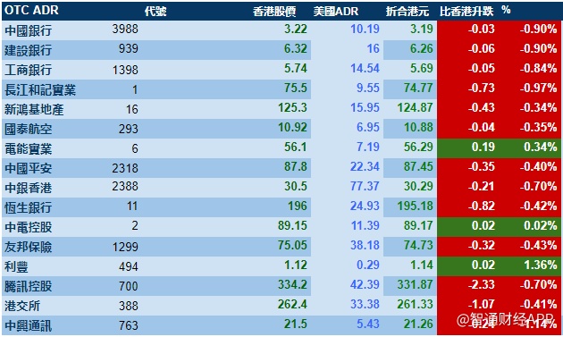 智通财经APP获悉,隔夜港股ADR指数全日偏软,按比例计算,收报27203点,跌91.39点。大型蓝筹微跌,汇丰控股收报64.28元,较港收市跌0.02元;腾讯控股收报331.87元,较港收市跌2.33元。