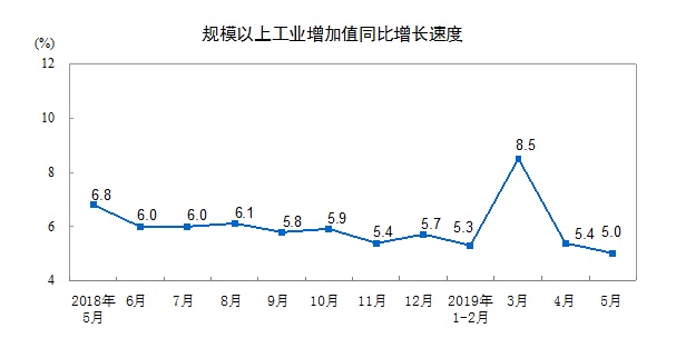 2019年5月份规模以上工业增加值增长5.0%
