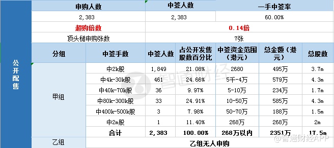 其中,公开配售申购人数2383,一手中签率60%,超购倍数0.14倍。