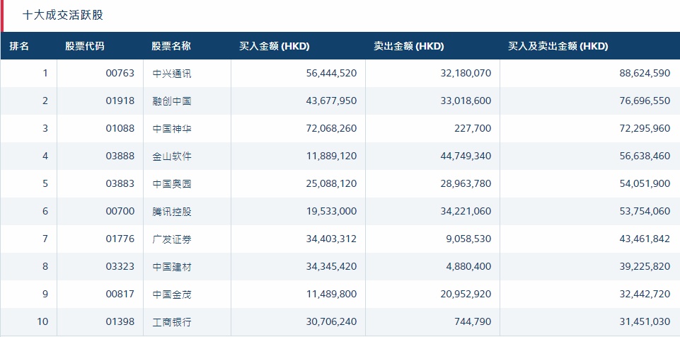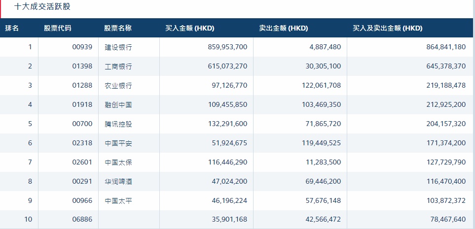 港股通(沪)十大活跃成交股