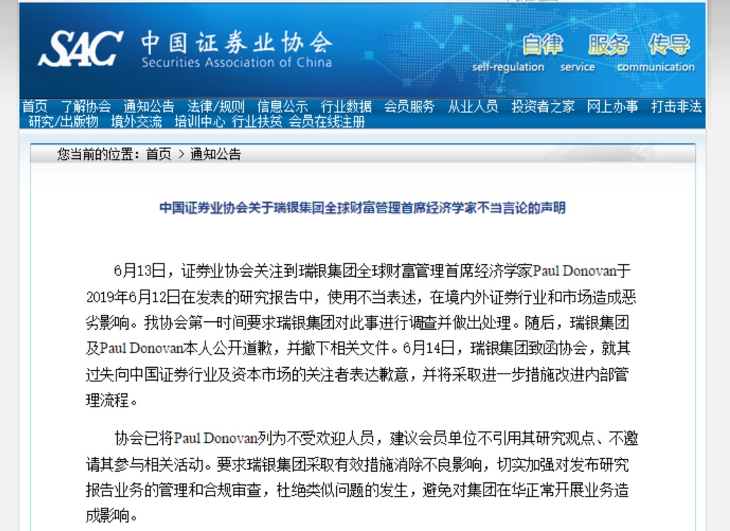 6月13日,证券业协会关注到瑞银集团全球财富管理首席经济学家Paul Donovan于2019年6月12日在发表的研究报告中,使用不当表述,在境内外证券行业和市场造成恶劣影响。我协会第一时间要求瑞银集团对此事进行调查并做出处理。随后,瑞银集团及Paul Donovan本人公开道歉,并撤下相关文件。6月14日,瑞银集团致函协会,就其过失向中国证券行业及资本市场的关注者表达歉意,并将采取进一步措施改进内部管理流程。