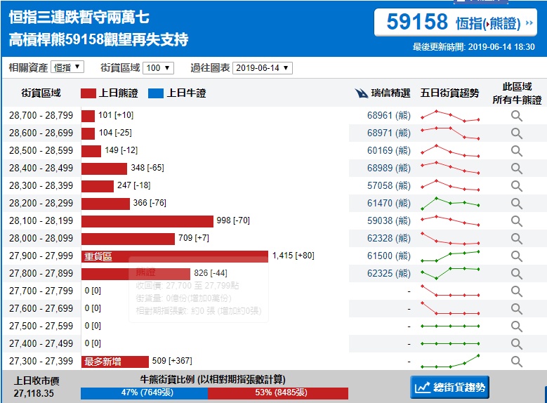 智通财经APP获悉,截至6月14日,恒指最新的牛熊街货比例47:53。瑞信恒指牛熊证街货分布图中的数据显示,熊证街货重货区在27900-27999间,该区间最新熊证数量为1415张,较上一交易日增加80张;最多新增区间在27300-27399区间。牛证街货重货区在26600-26699区间,该区间最新牛证数量为1068张,比上一交易日减少171张;最多新增区间在26900-26965区间。