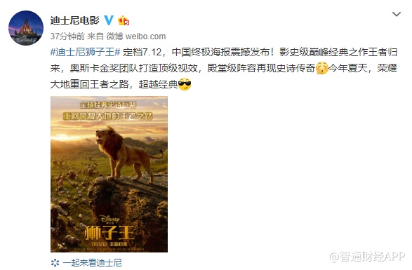 迪士尼(DIS.US)电影官方微博今日正式官宣,《狮子王》内地定档7月12日,提前北美一周。