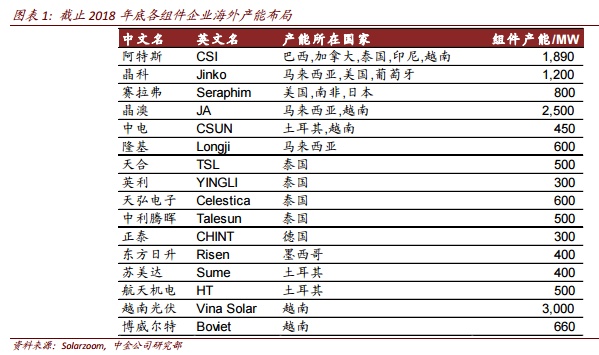USTR的豁免清单仅涉及201法案施加的25%进口关税,来自中国本土的光伏组件产品仍将面临14%-239%不等的双反关税。因此此次豁免将更为利好布局海外产能的双面组件制造商。截止2018年底,中国组件厂商在海外的产能达到14.6吉瓦,其中包括隆基股份的600兆瓦、阿特斯太阳能的1.9吉瓦以及晶科能源的1.2吉瓦产能都将有望受益。