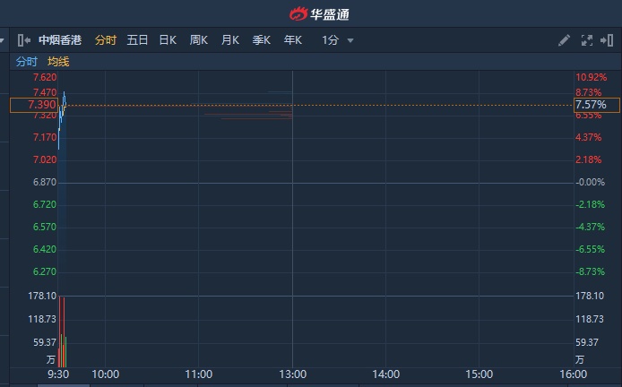 智通财经APP获悉,中烟香港(06055)上一交易日尾盘回落后,今日早盘再现强力拉升,截至9时34分,涨7.57%,报7.39港元,成交额达4648万港元。