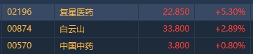 智通财经APP获悉,青蒿素概念股早盘悉数走高,截至发稿,复星医药(02196)涨5.3%,白云山(00874)涨2.89%,中国中药(00570)涨0.8%。