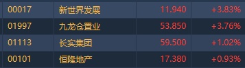智通财经APP获悉,香港地产股上周连续多日回调,今早盘随大市反弹,显著回暖,截至发稿,新世界发展(00017)涨3.83%,九龙仓置业(01997)涨3.76%,长实(01113)涨1.02%,恒隆地产(00101)涨0.93%。