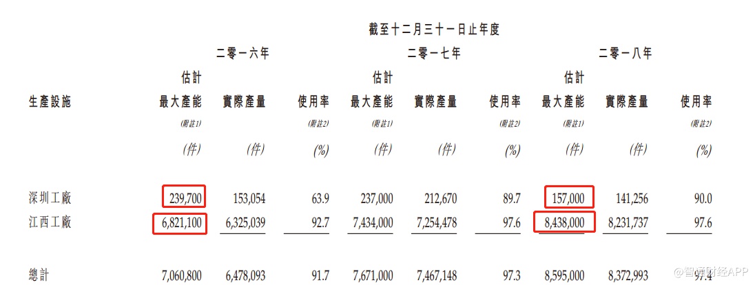 2016年时,深圳工厂的最大厂能为23.97万件,2018年下降至15.7万件,产能降幅高达34.5%。相反,江西工厂的厂能大幅增长,从2016年的682.1万增长23.7%至843.8万件。