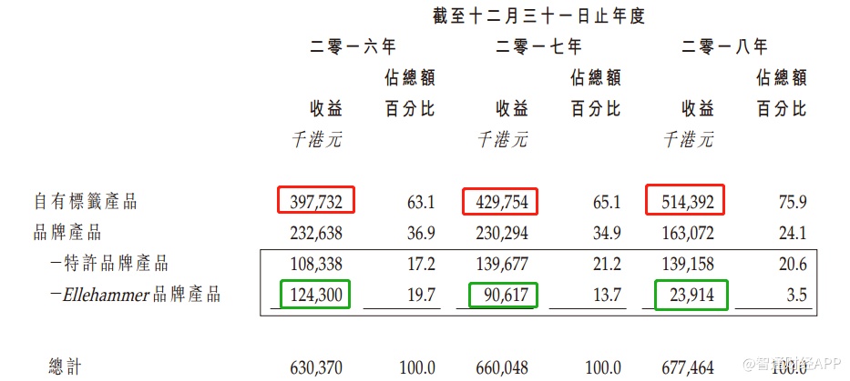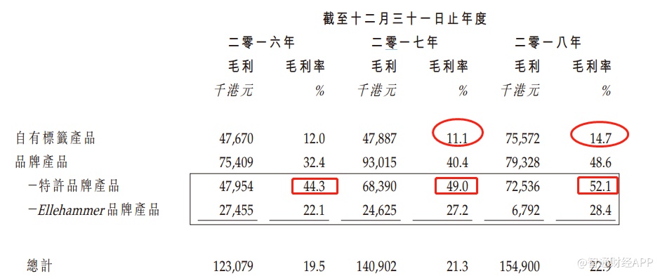 而自有品牌产品Ellehammer已逐渐“没落”,收入两连降,从2016年的1.24亿港元下降至2018年的0.24亿港元,降幅高达80%。毛利率最高的特许品牌产品收入则在2018年出现了轻微下滑,这主要是因为在2017年与一位特许品牌商合作协议结束后未继续签约。