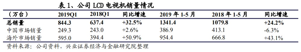 TCL电子1-5月增速小幅弱于行业主要系去年二季度存在高基数。18Q2受益小米代工需求和自主品牌产品力提升,TCL电子的销量增速较行业高 46.1pp.。在如此高基数下,今年 1-5 月能有如此表现难能可贵。