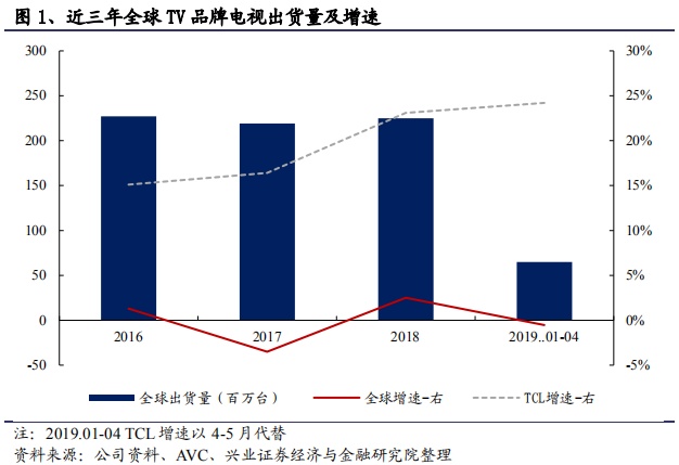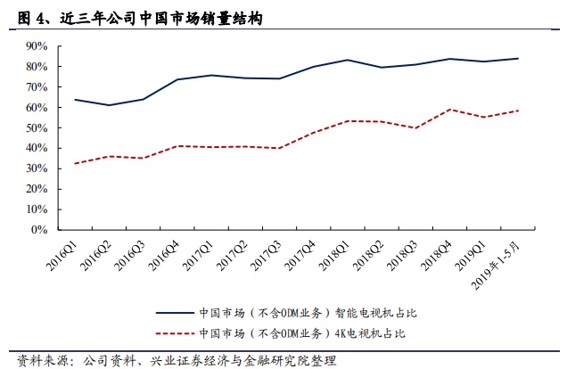 海外方面,公司着力寻求市占率提升,18 年全球市占率超越LG,上升至第二,仅次于三星,其中北美 19Q1 位居第二,3 月份攀升至第一。全球市占率仍有较大提升空间,未来有望依赖品牌、产品、渠道实力的逐步增强,继续提高全球市占率。