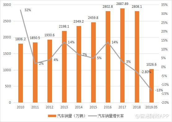 历史数据可以描绘出行业的发展规律及趋势,2010年及以前,国内汽车销量均能实现双位数的高增长,2011-2016年,基本每三年实现一次汽车消费繁荣期。但2016年以后,汽车行业不再重演三年一次繁荣期的规律,增速持续下滑,2018年实现历史首次负增长,2019首五个月负增长恶化。