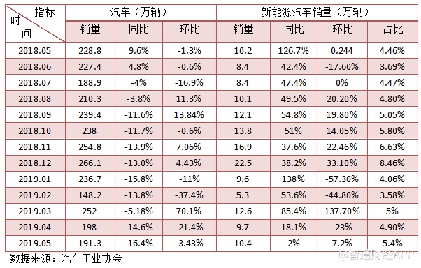 近日,中汽协发布数据显示,2019年5月,国内汽车销量完成191.3万辆,同比下降16.4%,乘用车销量156.1万辆,同比下降17.4%,迄今为止,汽车及乘用车已连续11个月销量下滑,另外,5月份新能源汽车销量10.4万辆,同比仅增长2%,连续两个月增速下滑。