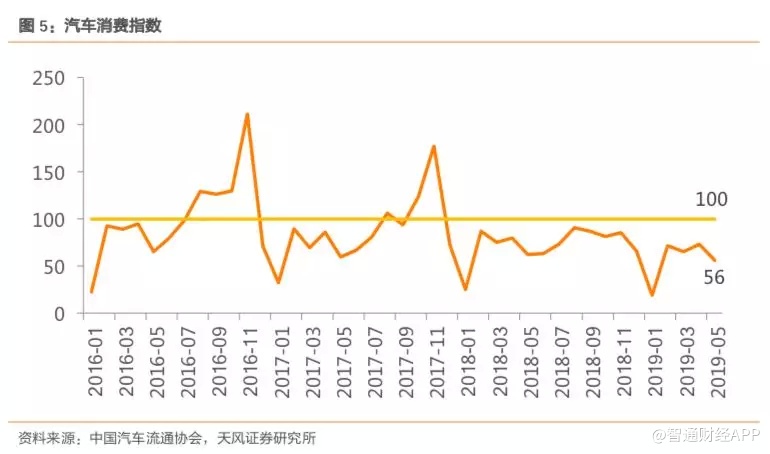 数据上看,2019年5月汽车消费指数为56,较4月份有所下降,市场观望情绪较重,5月经销商库存预警指数54%,连续四个月高于2018年同期,且均在荣枯线50%以上,存货清库压力较大。且按照去年消费指数及经销商库存预警情况看,今年下半年大概率销量会持续走低,经销商很大部分时间用在消化库存。
