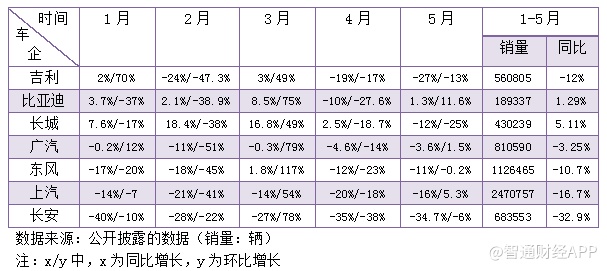 吉利、长城及比亚迪均为纯自主品牌的代表,而广汽、东风、上汽及长安除了自主品牌外,贡献最大的还是合资品牌。不考虑合资,就自主品牌来说,首五个月,广汽销量下滑38.2%,东风销量下滑46.1%,上汽销量下滑13.6%,而长安销量下滑30%。自主品牌销量下滑幅度有点大,首五个月合计下滑19.4%,跑输行业。