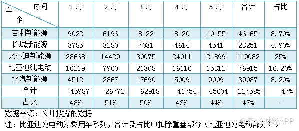 新能源汽车行业格局出现了一些变化,比亚迪呈现强者愈强的趋势,首五个月,比亚迪新能源汽车销量增长远超过行业水平,市场份额为25%,而2017及2018年为14.6%和19.7%,市占率连续三年不断提高。吉利成为新能源新秀,首五个月市场份额8.7%,超越北汽新能源,仅次于比亚迪。