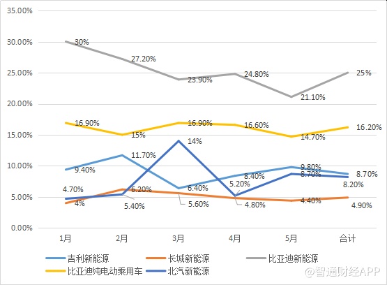 长城凭借着刚出来的欧拉品牌,首五个月也实现了新能源汽车23251辆的销量,市场份额4.9%,也成为行业的新起之秀,不过整个行业基数仍是较低的,起跑线差距不会很大,后期看谁跑得快,从而占有更大的市场份额。值得注意的是,北汽新能源市场份额从2017年13.3%下滑至8.2%(首五个月)。