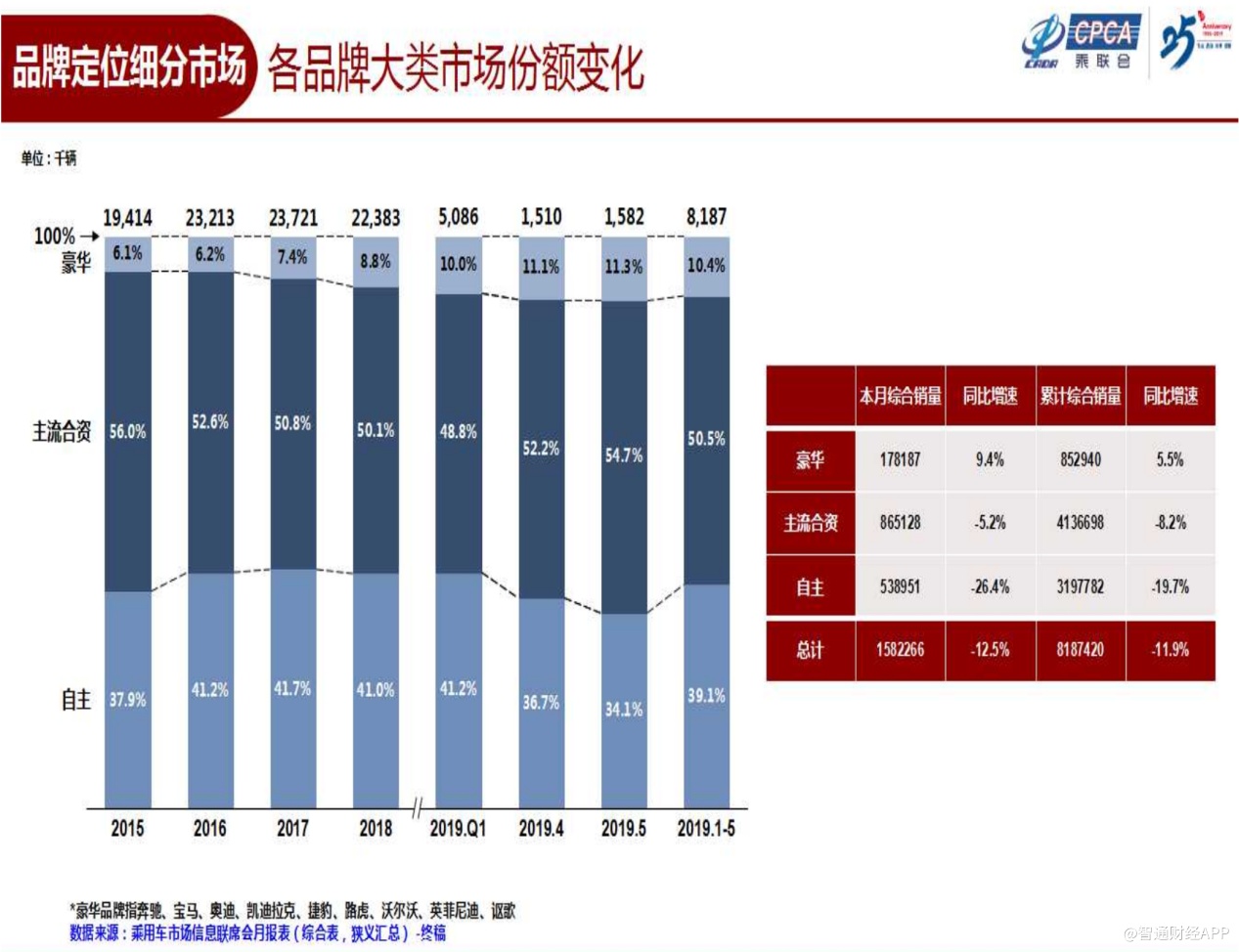 2019年首五个月,各个车企的销量数据都不理想,在列表的7家上市车企中,同比正向增长的仅有两家,分别是比亚迪(01211)和长城汽车(02333),但也仅有单位数的增长,大部分车企录得双位数的下滑,其中上汽作为销量龙头,市场份额24.1%,销量下滑幅度达16.7%。