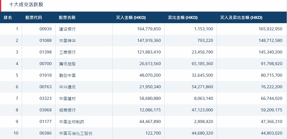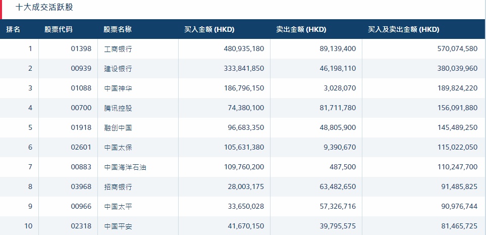 港股通(沪)十大活跃成交股