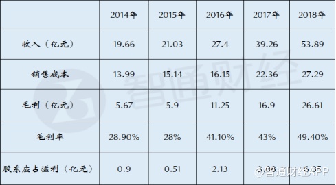 2014年公司收入为19.66亿元,股东应占溢利0.9亿元,到2018年公司收入提升至53.89亿元,股东应占溢利提升至6.35亿元,毛利率更是从28.9%大幅提升至49.4%。