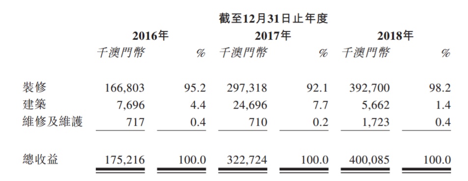 华记环球为澳门一家装修承包商。根据弗若斯特沙利文报告,按收益计,该集团为澳门2017年第三大装修承包商,拥有约3.7%的市场份额。集团所有收入均来自澳门,主要透过投标项目而来。截至2016年、2017年及2018年12月31日止年度,其总收益分别约为175.2百万澳门币、322.7百万澳门币及400.1百万澳门币。