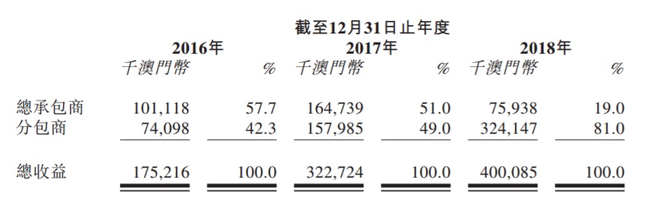 视乎内部资源水平、工程性质、项目复杂程度及成本效益,该集团可向其他分包商外派项目若干工作。于往绩记录期间,集团分包的工程主要包括拆卸工程、地基及结构工程、装修工程以及建筑设备系统安装。截至2018年12月31日止三个年度各年,支付予该集团最大分包商的分包费用分别约占本集团分包费用总额的22.7%、10.4%及33.9%。