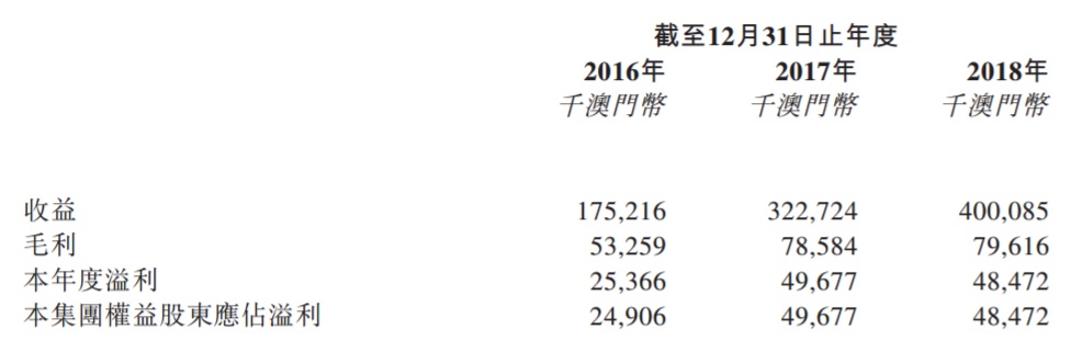 华记环球的收益由截至2016年12月31日止年度的约175.2百万澳门币增加约84.2%至截至2017年12月31日止年度的约322.7百万澳门币,又增加约24%至截至2018年12月31日止年度约400.1百万澳门元。
