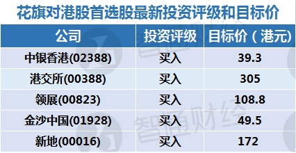 智通财经APP获悉,花旗发表亚太区2019年下半年市场展望报告称,恒指目前估值相当预测今年市盈率11.8倍,对比平均值12.5倍,并维持对恒指今年目标30000点水平。该行同时列出对港股最新首选股,包括中银香港(02388)、港交所(00388)、领展(00823)、金沙中国(01928)、新地(00016) 。