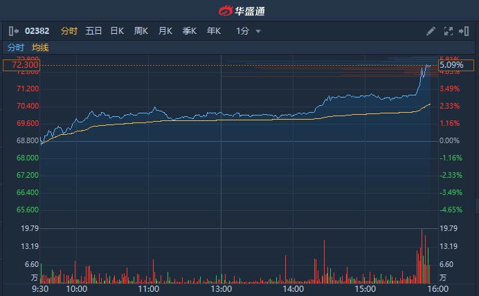 智通财经APP获悉,舜宇(02382)尾盘加速上行,涨幅现扩大至5%,报72.3港元,成交额达4.817亿港元。