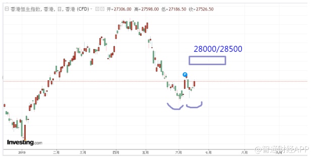 而恒生指数也一样,在短线中出现一个小双底,反弹目标在28000/28500左右。但短线必须留意6月19日及6月24日的江恩转势日,可能在此时反弹会受阻。