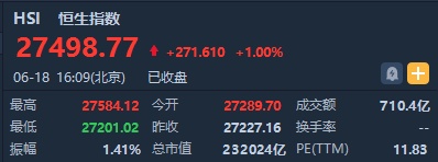 截至收盘,恒生指数涨271.61点或1%,报27498.77点,全日成交额达710.47亿。国企指数涨0.76%,报10507.65点,红筹指数涨0.05%,报4284.16点。