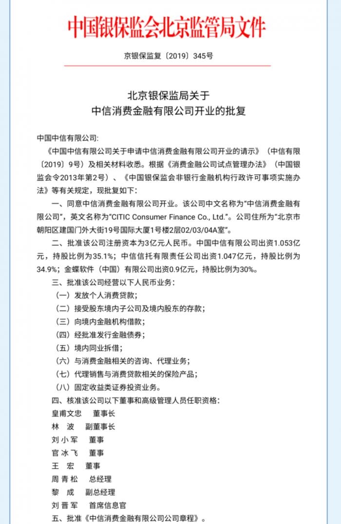 公告显示,批准中信消费金融注册资本为3亿元人民币。中国中信有限公司出资1.053亿元,持股比例为35.1%;中信信托有限责任公司出资1.047亿元,持股比例为34.9%;金蝶软件(中国)有限公司(00268)出资0.9亿元,持股比例为30%。