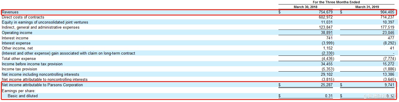 智通财经APP获悉,美国国防科技股Parsons(PSN.US)公布一季度财报,截至2019年3月31日止三个月,公司营收为9.04亿美元,同比增长20%;归属于公司的净利润974万美元,同比降低61%,每股摊薄收益为0.12美元。