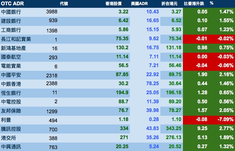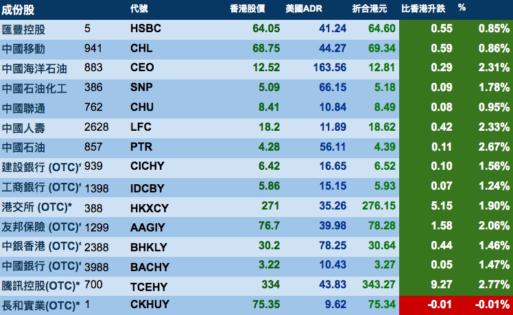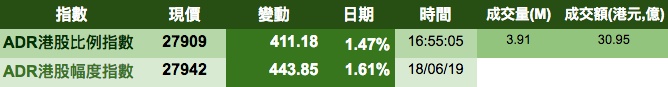 智通财经APP获悉,美股大幅反弹,刺激港股ADR指数全日向好,按比例计算,收报27909点,涨411.18点。大型蓝筹股全线走强,汇丰控股收报64.6元,较港收市涨0.55元;腾讯控股收报343.27元,较港收市涨9.27元。