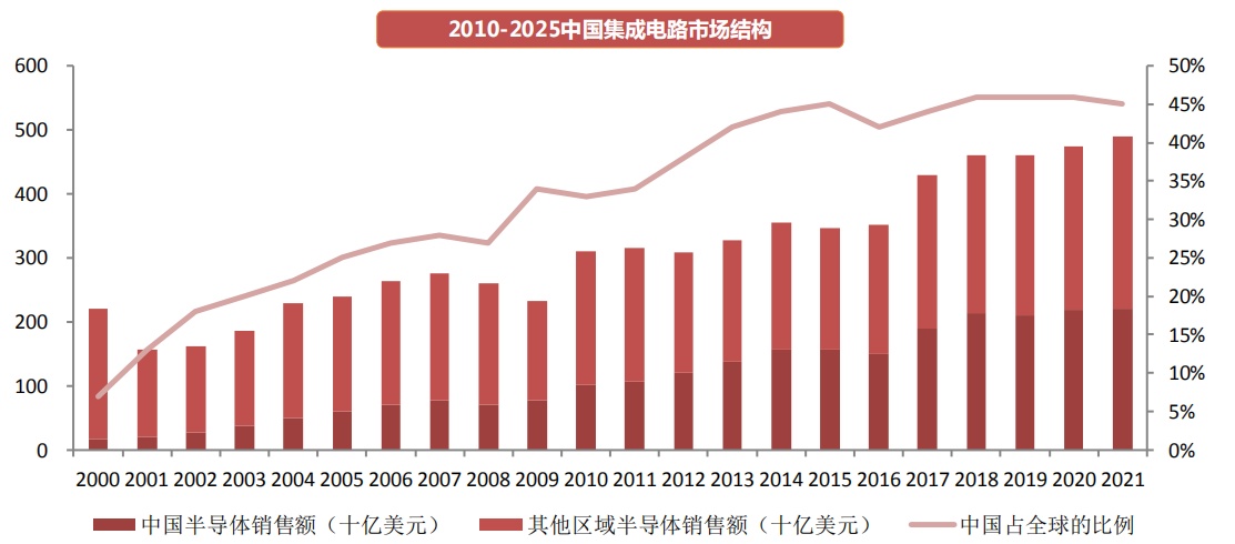 而第三次产业转移,则有望发生在中国内地。2017年时,我国的半导体需求为1892亿美元,占全球市场的比例高至44.1%。中国是全球最大的消费市场,近年来的半导体市场一直在快速增长,更为重要的是,在5G的推进过程中,自动驾驶、物联网、大数据等新兴行业将带来新的需求增量。