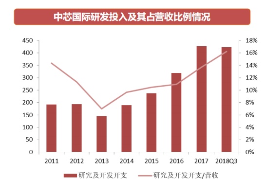 与三星、台积电相比,中芯国际作为后来者确实在制程上相对落后,但其研发支出并不含糊,自2013年触底反弹后,研发占收入的比例持续提升,2018年时,该比例为16.52%,是台积电的一倍。