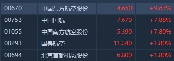智通财经APP获悉,航空股自4月以来持续回调,今日终随大市强势反弹,截至发稿,东航(00670)涨9.67%,国航(00753)涨7.88%,南航(01055)涨7.8%,国泰航空(00292)、北京首都机场(00694)涨近2%。