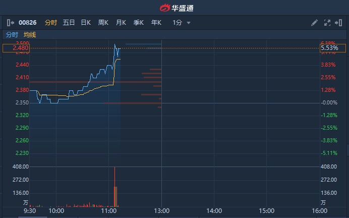智通财经APP获悉,天工国际(00826)盘中直线走高,突破所有均线压制,截至11时10分,涨5.53%,报2.48港元,成交额达3690万港元。